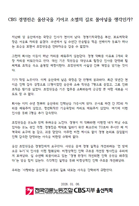 [울산지회 성명]CBS 경영진은 울산국을 기어코 소멸의 길로 몰아넣을 생각인가?